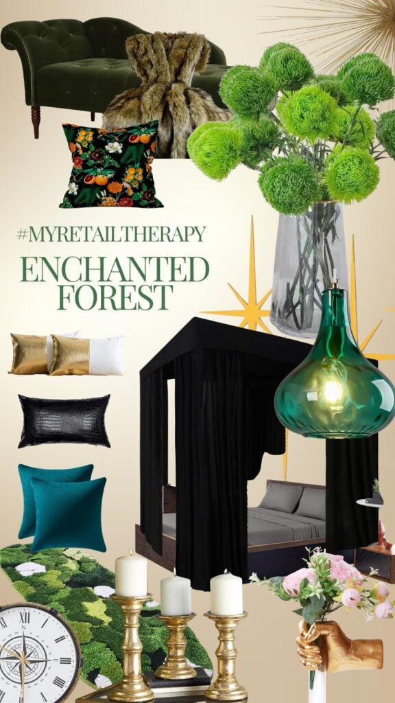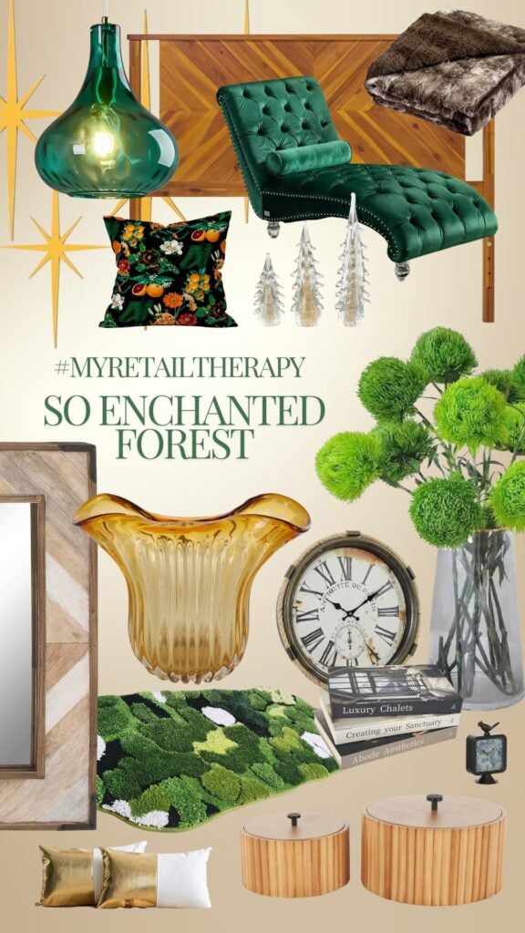 Starburst Wall Decor | Emerald Raindrop Pendant Light | Wood Bed Headboard | Plush Fur Throw Blanket | Emerald Chaise Lounge | Ice Glass Trees | Amber Vase | Wood Mirror | Antique Look Clock | Forest Rug | Luxury Books | Green Floral Decor | Retro Bird Clock | Gold and Cream Accent Pillows | Wood Tabletop Containers