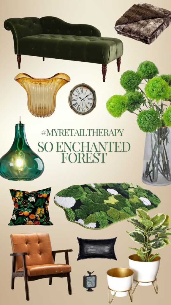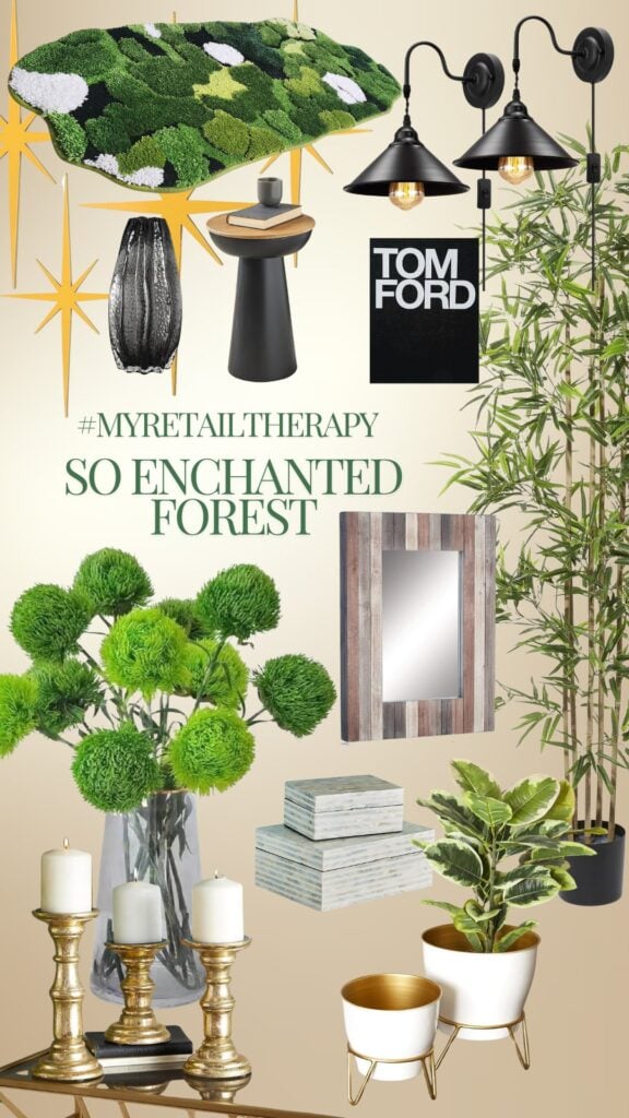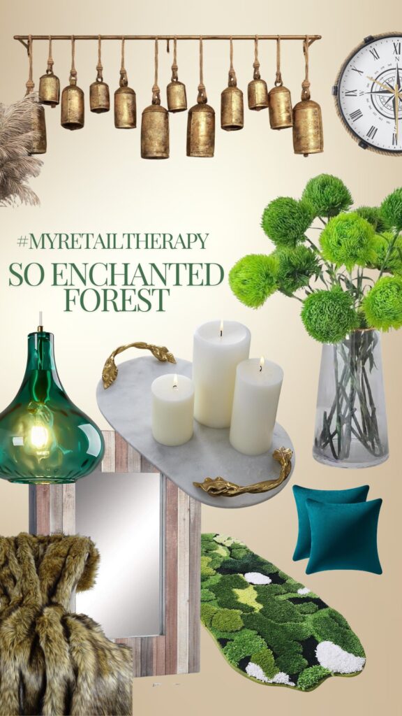 Get The Look: Brass Cow Bell decor | Antique Look Clock | Floral Greenery | Marble Tray | Emerald Raindrop Pendant Light | Green Throw Pillows | Forest Rug | Wood Mirror | Plush Fur Rug