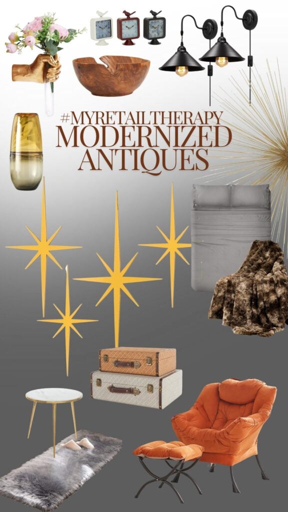 Get the Look: Modernized Antiques: Starburst Wall Decor | Plush Gray Rug | Luggage Decorative Storage | Mid-Century Marble Top Table | Mid-Century Orange Chair | Plush Fur Blanket Throw | Charcoal Cooling Bed Sheets | Bedside Water Glass | Gold Spike Decor | Black Wall Lights | Acacia Wooden Bowl | Gold Hand Wall Vase | Antique Look Bird Clocks